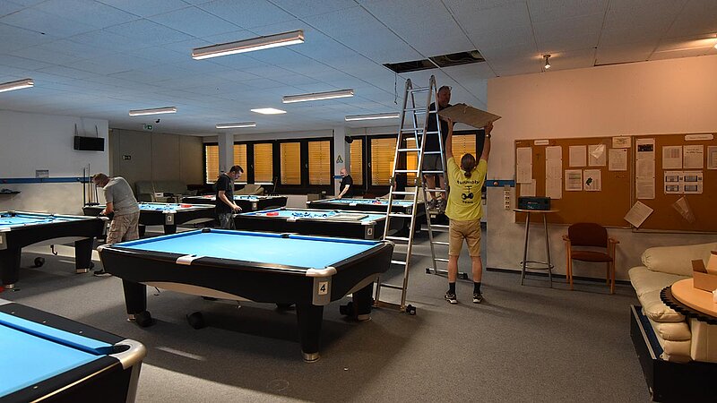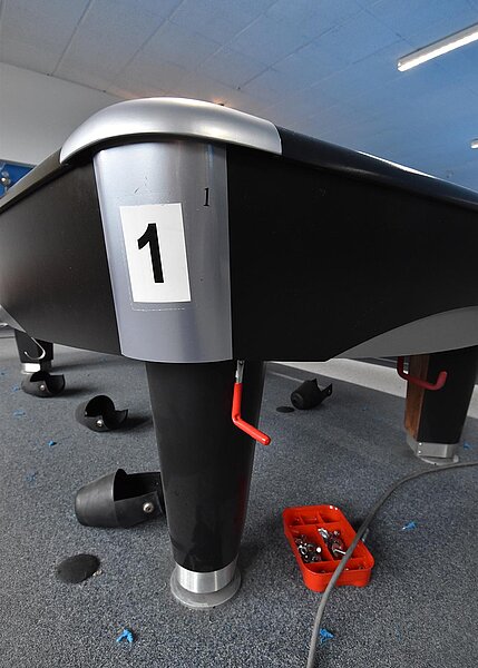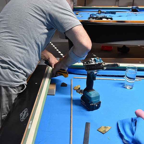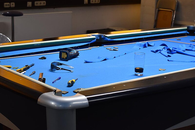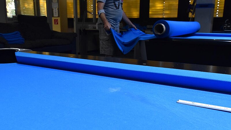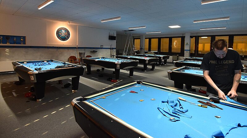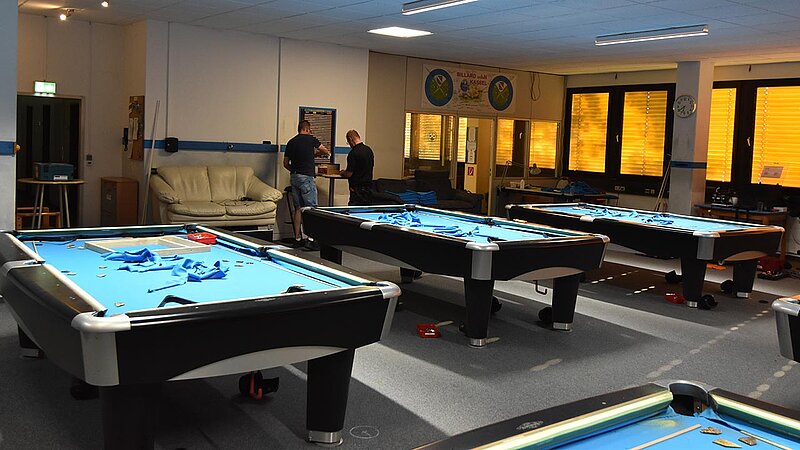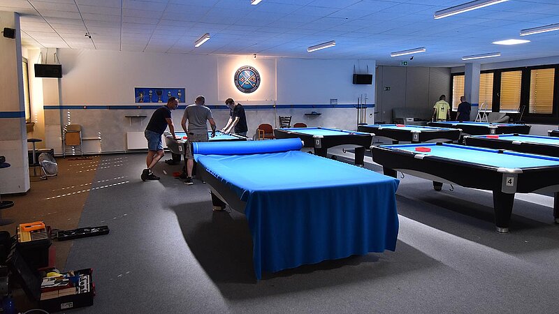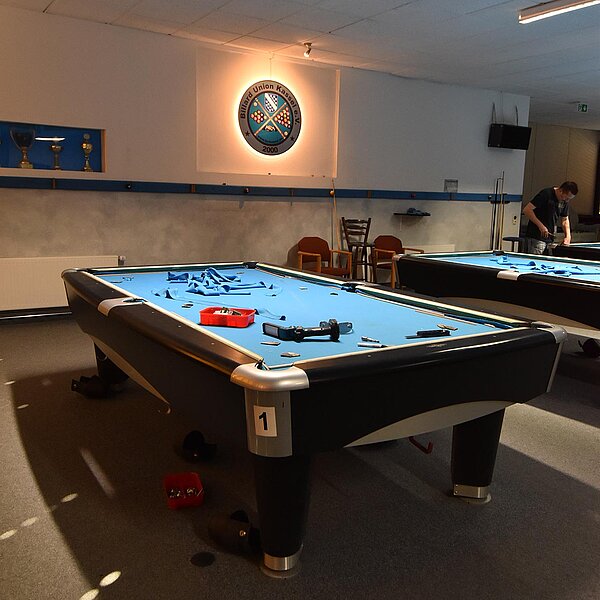 Im Verein werden unsere Tische entsprechend beansprucht und so ist regelmäßig nötig, das Tuch zu wechseln. 2025 kehren wir zum Z9 zurück, das für uns Billard-Sander aufzieht. Und so ist unser Verein mal wieder für 2 Tage Baustelle. Die Gelegenheit, auch gleich noch Tablets an den Tischen zu anzubringen.